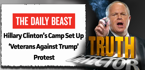 The Hillary campaign saw it. Soon as they saw it, the Hillary campaign hired a bunch of rent-a-mobsters, Astroturfers, if you will, to pretend to be veterans and to protest in front of Trump Tower. The media knew this. The media knew it was all made up. And, in fact, of all places, the Daily Beast, which is not the Daily Caller. The Daily Beast is on the left side of the aisle. “Hillary Clinton’s Camp Set Up Veterans Against Trump Protest.”