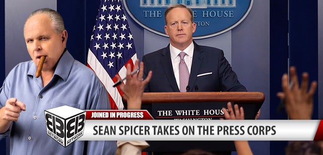 A, he’s a Republican. So he’s deficient just because of that. He’s never done this, number two. He’s never faced them, in their minds, number three. And they expect him to be Dan Quayle-like — you know, deer in the headlights, frozen in fear and intimidated and bullied by the fact that they are the big Drive-Bys at the White House press corps. And Spicer is unaffected. He is not overawed. He is not bamboozled. He’s not quaking in fear. He’s not nervous. He’s not stuttering, and… (laughing) I just think that it’s kind of clever here to replace their focus on Russian hackery going back now to the fact that maybe millions of illegals voted. (laughing)