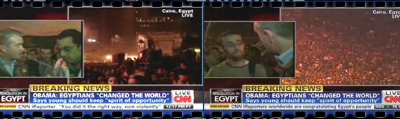 So Nic Robertson, every the intrepid, trench coat clad reporter in great Peter Jennings tradition refused to give up. He continued to search Tahrir Square to find the one protester who wanted to owe it all to Obama. And he found the next one.