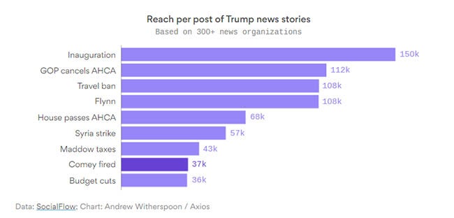 “SocialFlow evaluated the Facebook reach of articles on major flashpoints by more than 300 news organizations within a few days of the event …” 150,000 on the inauguration, 112,000 GOP cancels Obamacare, 108,000 for both the travel ban and the Flynn stories, 68,000 for the House version of Obamacare repeal, 57,000 for the Syria strike, 43,000 for the Rachel Maddow Trump tax story. Just 37,000 for Comey being fired. My point is, it isn’t the viral out there where the people who make the country work live.