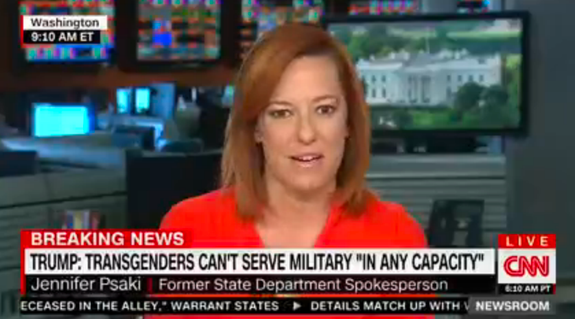 So Trump comes along and, in consultation with his generals, just proclaims that we’re not gonna do this anymore. It doesn’t comport with the mission. Audio sound bite number 18. Jen Psaki. She’s the former Obama White House communications director, and she was in the same position in the Hillary Clinton presidential campaign. On CNN the host John Berman said, “This was from a President Obama decision Obama made to open up the military to transgender troops. Your reaction now to Trump’s statement, what is it?”
